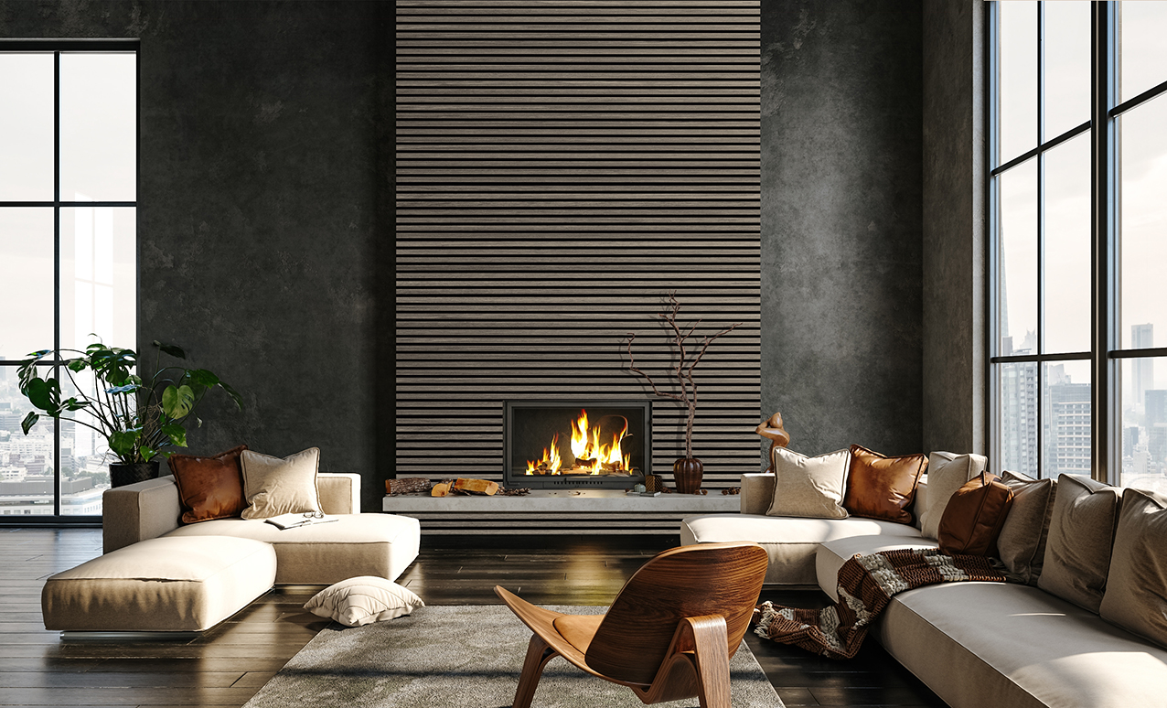 The size of each panel for most of the products offered is 22 x 605 x 2440 mm and consists of a 9 mm thick rigid polyester base onto which MDF laths are glued with natural knife-veneer are attached. The width of each lath is 25 mm, the distance between them – 15 mm. The polyester base has excellent sound absorbing properties, especially against background noise, that helps to significantly improve the acoustic comfort of the premises. Moreover, laths with natural wood veneer form a decorative pattern and give a visually pleasant overview of natural material. 100 % FSC (Forest Stewardship Council) certified wood is used for the veneering, the polyester base is made from recycled raw materials.
